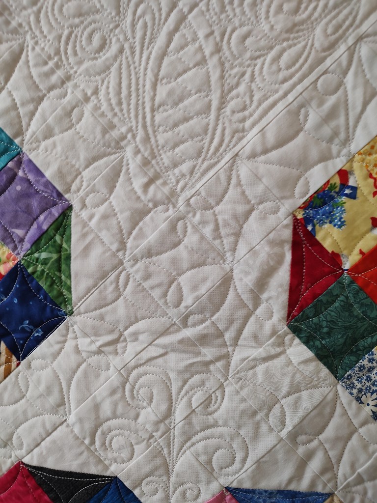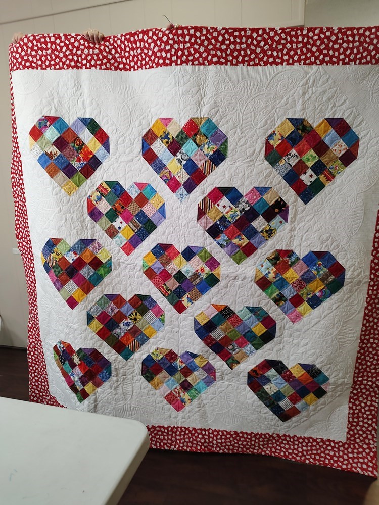 72"x72" handmade quilt. Sewn and quilted by Laura Ewen, shown in the Quilting Guild of Fredericksburg show. This quilt features top loops, on the backside so it can be hung, as well as used as a blanket. Laura is a retired Air Force Captain and an officer of the Daughters of the American Revolution. She is an avid quilter and makes several quilts for charity every year. She made the quilting designs on her longarm machine in the Texas Hill country. Fair Market Value: $250