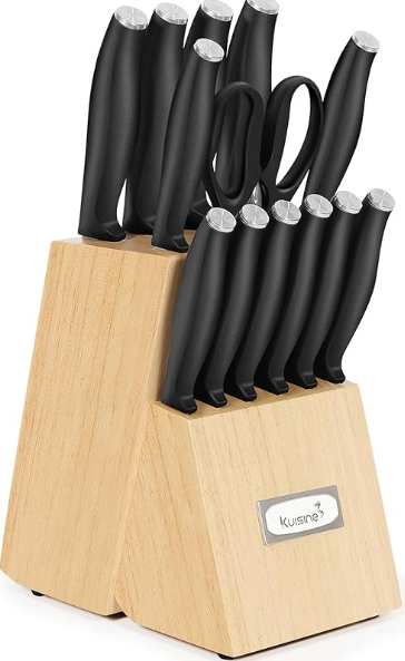 High Carbon Stainless Steel, Ultra Sharp Blades. Ergonomic Handles Includes a 8" chef knife, 8" Slicing Knife, 7" santoku knife, 8" serrated bread knife, 5"utility knife, 3.5"paring knife, six 5"steak knives, 1 pair of kitchen shears and a wooden block with built-in sharpener.