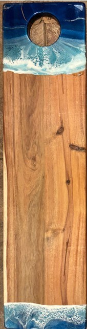 This beautiful, beach-themed Charcuterie board is made of hardwood with a resin water decoration. Approximately 31" long by 8-1/2" wide, this item is locally hand decorated in Fulshear, TX.