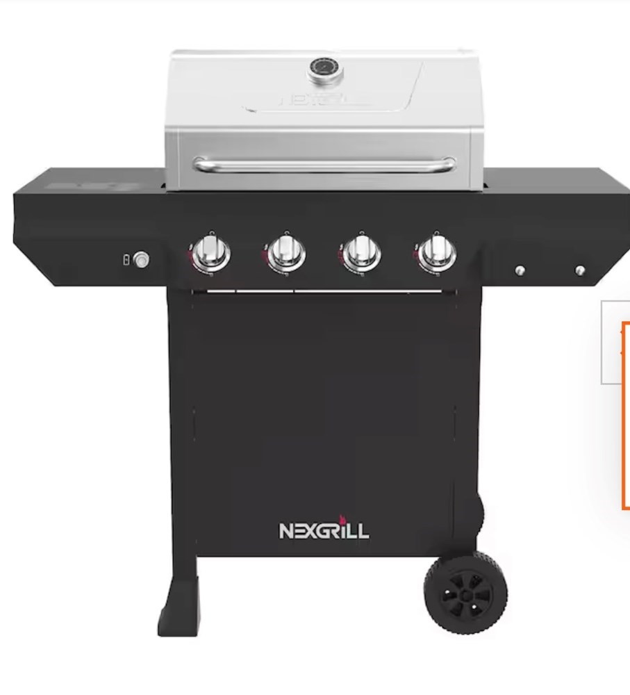 4-Burner Nexgrill Gas Grill About This Product The NEW Nexgrill 4-Burner Gas Grill is constructed of polished stainless steel and porcelain coated steel. With 566 sq. in. total cooking surface our Nexgrill 4 burner grill offers plenty space to cook for parties of up to 6. An even heat cooking system with stainless steel burners, angled flame tamers and cast iron cooking grates work together to distribute consistent heat across the entire grilling surface while reducing flare-ups. Make your next grill a Nexgrill. Highlights Total cooking area 566 sq. in. primary: 421 sq. in. warming rack: 145 sq. in. 4 stainless burners are durable and retain heat well for even cooking 40,000 BTUs main burners for ultimate grilling control Cast-iron cooking grates provide even heat Side shelves offers a convenient prep area Battery operated electronic igniter system 2 large wheels for easy transportation With 566 sq. in. total cooking Assembly Required Compatible with the Universal Rotisserie Kit OMSID# 206416016 or SKU# 1001537769