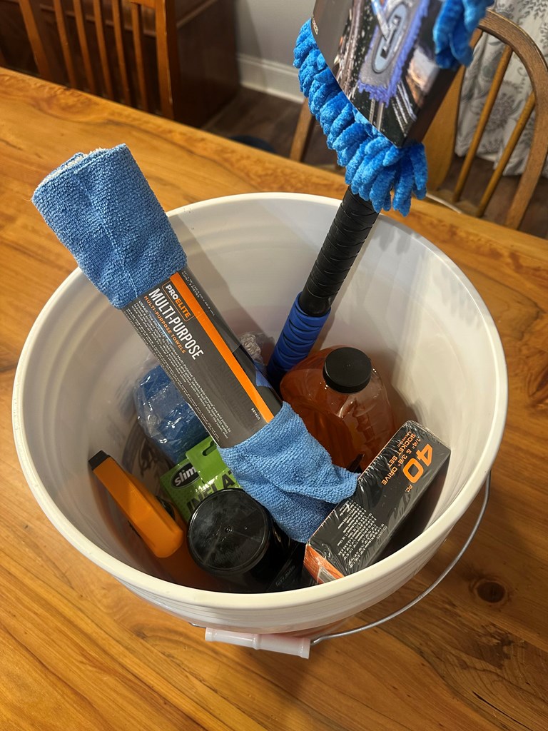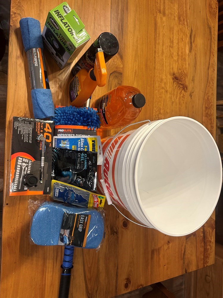 Car wash bucket containing microfiber brush, towel, sponge, armorall wash and multi-prpose cleaner, 40-piece socket set, tire inflater, tire shine and coating, flashlight, car fresheners, glass cleaner wipes, tire pressure gauge, cleaner gel, and a bucket. 5-$7 off oil change coupons.