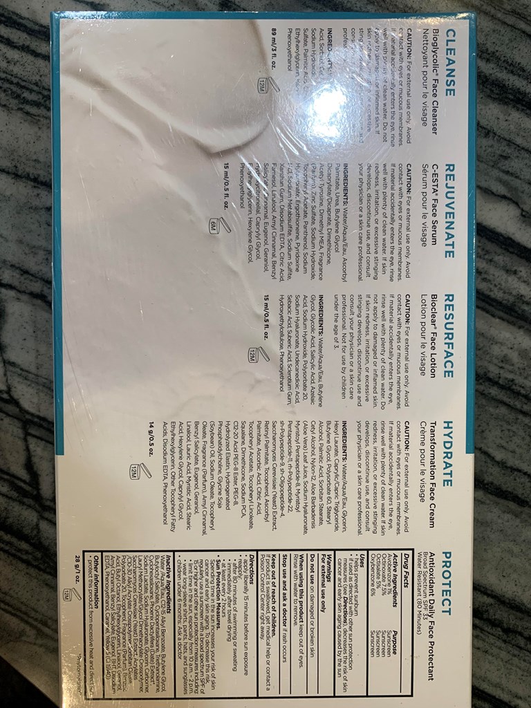Jan Marini Bioglycolic Face Cleanser, C-Esta Face Serum, Bioclear Face lotion, Transformation Face cream, and Antioxidant daily face protectant.