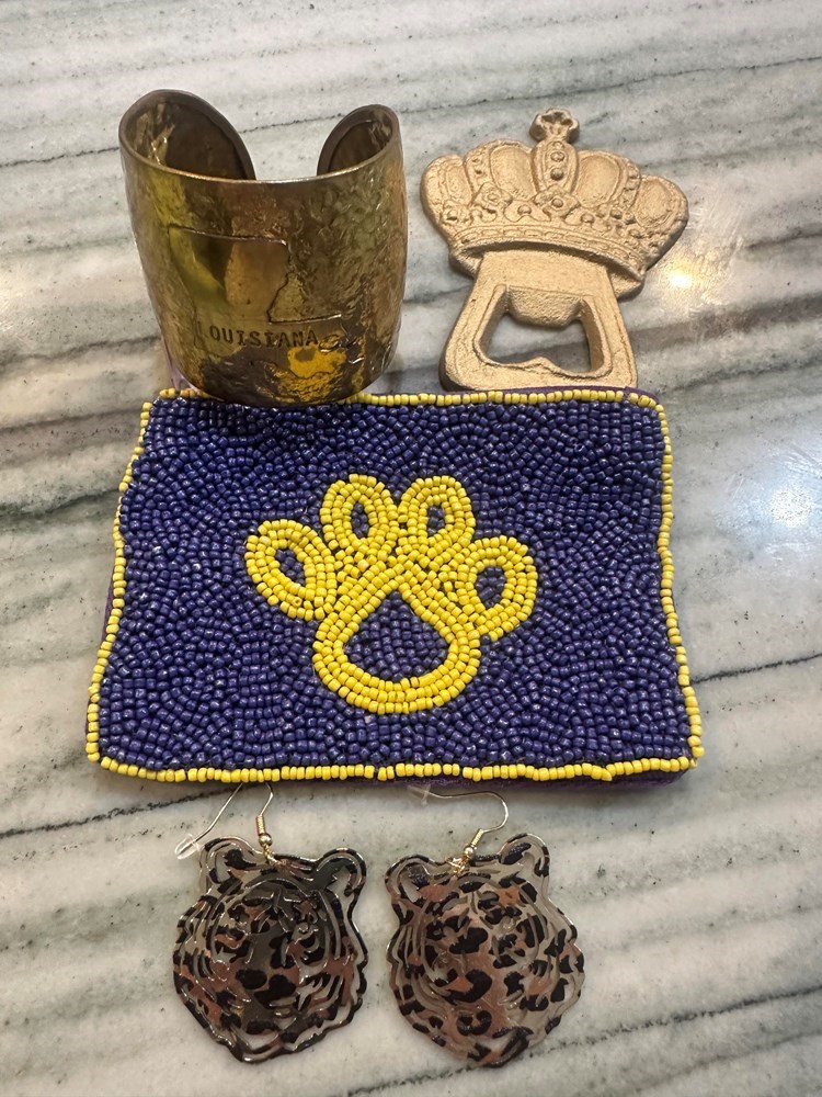 Women's Louisiana Lagniappe $100 Handmade metal Louisiana cuff, LSU seeded coin purse, metal crown bottle opener, and Tiger head earrings