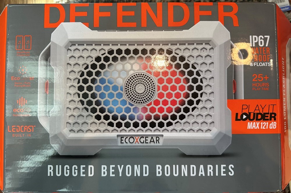 The ECOXGEAR® DEFENDER Waterproof Bluetooth Speaker gives you powerful audio with weatherproof protection and indoor/outdoor-grade durability. A 100W dynamic Texas Instruments power amplifier delivers massive sound, while 3 digital equalizer settings let you select the perfect sound for your favorite outside adventure or inside your home. An IP67 waterproof rating means the DEFENDER can withstand full submersion for in up to 1m for up to 30 minutes. Dustproof sealing provides another barrier against the elements. An integrated microphone gives you the option of taking voice calls on speakerphone, complete with support for popular voice assistants. You can control the built-in party LED lights from the speaker keypad or the SOUNDEXTREME app. The internal, rechargeable battery runs up to 25+ hours, and AC power keeps the party going while the DEFENDER charges up for more outdoor fun. Weight: 10 lbs. Powerful 100W Texas Instruments dynamic amplifier 6x9 full-range main driver with 1.7" titanium tweeter 3 EQ settings IP67 waterproof and dustproof Bluetooth 5.1 wireless connectivity Adjustable LED lights Integrated microphone with voice-assistant support Built-in, rechargeable battery AC power option to play while charging