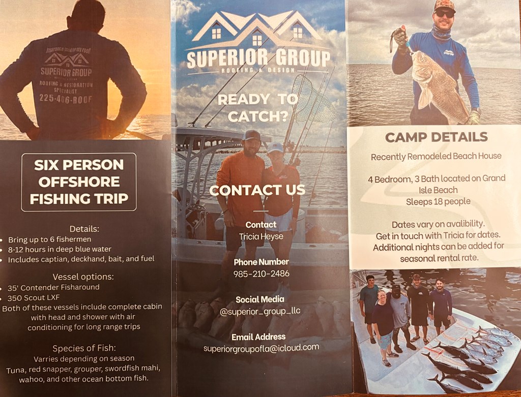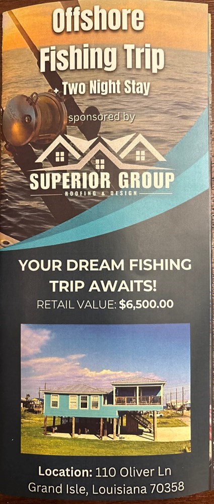 Must be in attendance 2/5/2026 to bid. 110 Oliver Ln, Grand Isle, LA Completely remodeled this winter, this beachfront property features 4 bedrooms and 3 bathrooms and can accommodate up to 6 guests for a 2-night stay. The trip includes deep blue-water offshore fishing (8–12 hours) for up to 6 anglers, targeting species such as tuna, snapper, grouper, mahi, wahoo, and seasonal bottom fish. Availability: Dates are flexible based on current availability. Most weekends are booked for the year, though some remain open. Most Monday–Friday dates are available. What’s Included: Captain and deckhand Bait and fuel Choice of vessel: 36’ Contender Fisharound 350 Scout LXF Both vessels feature a full cabin with head, shower, and air conditioning, ideal for long-range trips. Retail Value: $6,500
