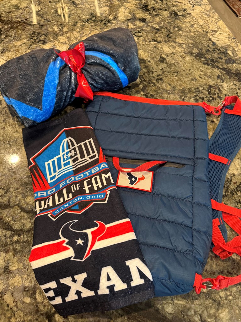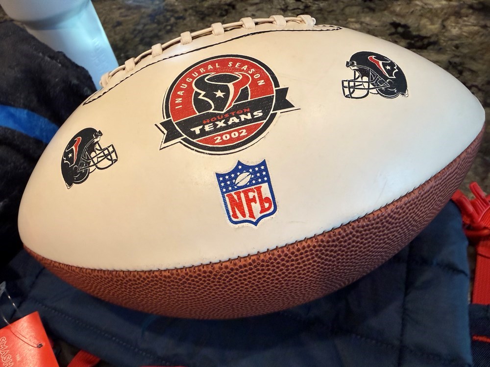 A must for a Houston Texans Fan: a inaugural (2002) season Wilson football; CUSTOM made Texans Monti backpack-style packable travel cooler which is valued at $129; CUSTOM made insulated Texans cup; CUSTOM made Texans blanket; Texans towel from Football Hall of Fame. The custom made items were made only for the highest tier sponsors of the Houston Texans. FMV: $234