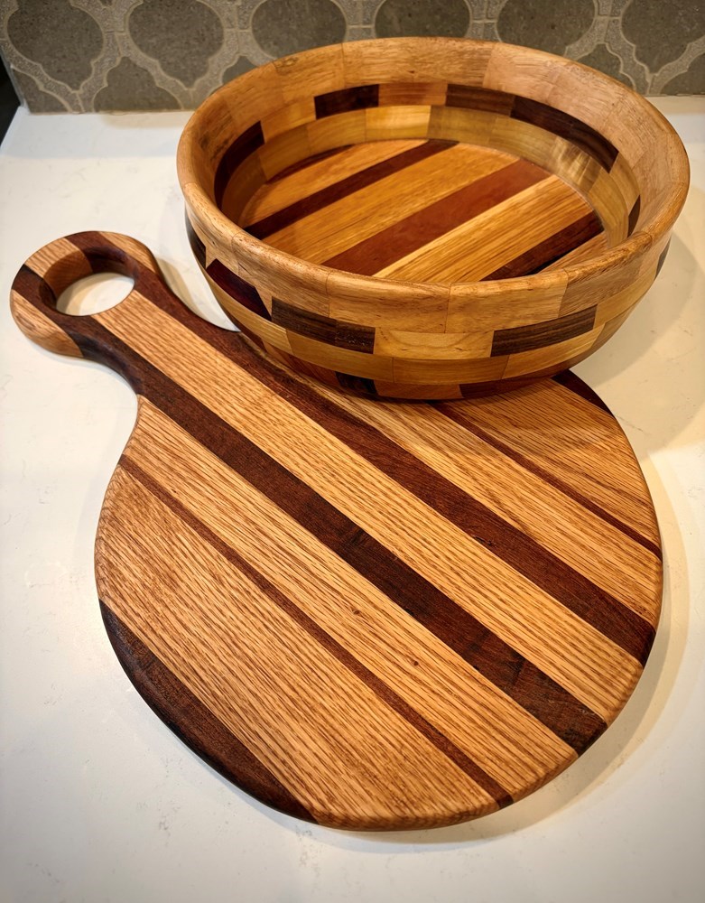 Beautifully hand crafted by Fulshear artisan, Paul Foster. The bowl and board are made from locally sourced hardwoods (mostly reclaimed) of oak, walnut, mahogany, and cherry woods. These are finished with food-grade finish and are an eye catching way to display your charcuterie or snacks, or to just decorate your table. These are perfection! Dimensions: 11" Board, 11"W x 3"D Bowl Can be rinsed off with soft brush and plain water. Fair Market Value: $150