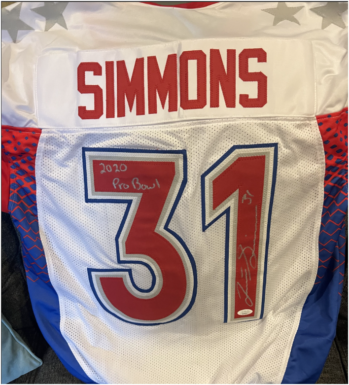 Add a standout piece to your sports memorabilia collection with this authentic 2020 Pro Bowl jersey signed by Justin Simmons (#31). This exclusive item celebrates one of the league’s top defensive standouts and his appearance in the 2020 Pro Bowl. ✨ Item Highlights: Official 2020 Pro Bowl jersey design Personally autographed by Justin Simmons (#31) Signature placed prominently for display Ideal for framing, collectors, sports fans, or charity auctions Excellent condition — a true centerpiece for any memorabilia collection This signed jersey is a must‑have for dedicated fans and collectors looking to own a piece of football history. Don’t miss your chance to add this standout Pro Bowl collectible to your lineup!