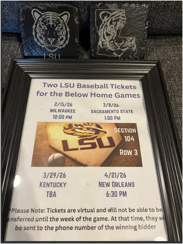 ***Live Auction only*** Must be in attendance on 2/5/26 to bid. Cheer on the Tigers in style with this exciting LSU Baseball package! Perfect for fans, alumni, auction baskets, or sports collectors, this bundle includes two LSU baseball tickets for multiple 2026 home games—plus two sets of decorative slate art tiles (4 in each pack). 🎟️ Ticket Details: You will receive 2 virtual tickets (Section 104, Row 3) to each of the following 2026 LSU home games: February 15, 2026 – Milwaukee @ 12:00 PM March 8, 2026 – Sacramento State @ 1:00 PM March 29, 2026 – Kentucky – Time TBA April 21, 2026 – New Orleans @ 6:30 PM 📌 Important Note: Tickets are virtual and will be transferred the week of each game to the phone number of the winning bidder. This package is a fantastic opportunity to experience LSU baseball up close. A must‑have for any true LSU fan!