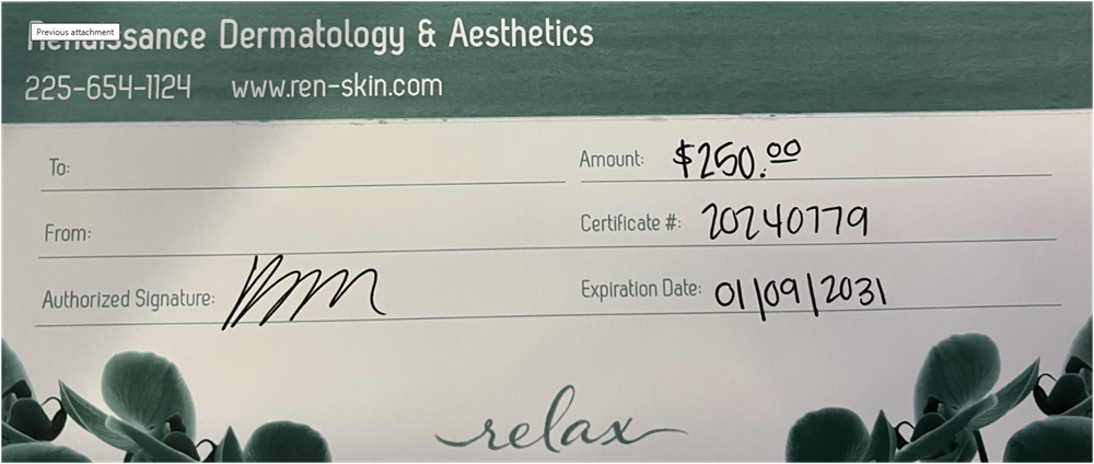 ✨ Renaissance Dermatology & Aesthetics – $250 Gift Certificate ✨ Treat yourself or someone special to professional skincare and aesthetic services with this $250 gift certificate from Renaissance Dermatology & Aesthetics. Perfect for rejuvenating treatments, medical‑grade skincare, or pampering services tailored to enhance natural beauty. 📄 Gift Certificate Details: Amount: $250 Certificate #: 20240779 Expiration Date: January 9, 2031 Valid at Renaissance Dermatology & Aesthetics May be applied toward a variety of skincare and aesthetic services 💚 Ideal For: Facials & advanced skincare treatments Cosmetic dermatology services Relaxation & self‑care experiences Gift baskets, fundraisers, and holiday gifting Give the gift of confidence and glowing skin with this long‑valid, flexible skincare certificate—perfect for anyone who deserves a little extra pampering.