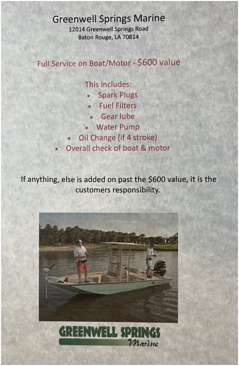 🚤 Greenwell Springs Marine – Full Boat & Motor Service Package ($600 Value) 🚤 Keep your boat running smoothly and safely with this comprehensive full‑service package from Greenwell Springs Marine in Baton Rouge, LA. Valued at $600, this service covers essential maintenance to ensure your boat and motor are in top condition for your next trip on the water. 🛠️ Package Includes: Replacement of spark plugs Fuel filters Gear lube service Water pump replacement Oil change (for 4‑stroke motors) Complete overall inspection of both boat and motor This service provides everything needed for reliable performance and peace of mind on the water. 📍 Location: Greenwell Springs Marine 12014 Greenwell Springs Road Baton Rouge, LA 70814 ℹ️ Note: Any additional services exceeding the included $600 value will be the customer’s responsibility. Whether preparing for a new season or keeping up with regular maintenance, this full‑service package is a valuable investment for any boat owner.