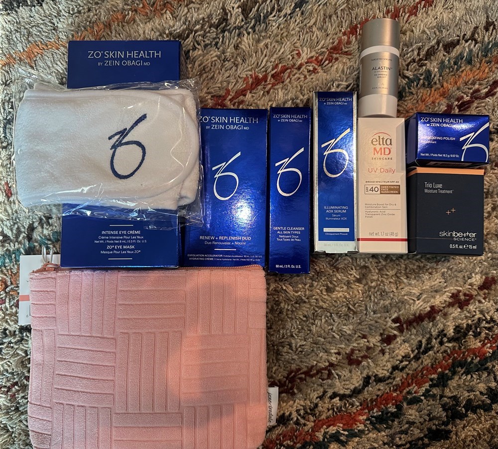 Intense Eye cream, Illuminating AOX Serum, Gentle Cleanser, Renew and Replenish Duo, Exfoliating polish, Trio Luxe Moisture treatment, Elta MD Sunscreen, Alastin Immerse Serum, Beauty headband. Make-up bag with Jane Iredale products: Blush, Eye shadow, makeup brush and lip gloss.