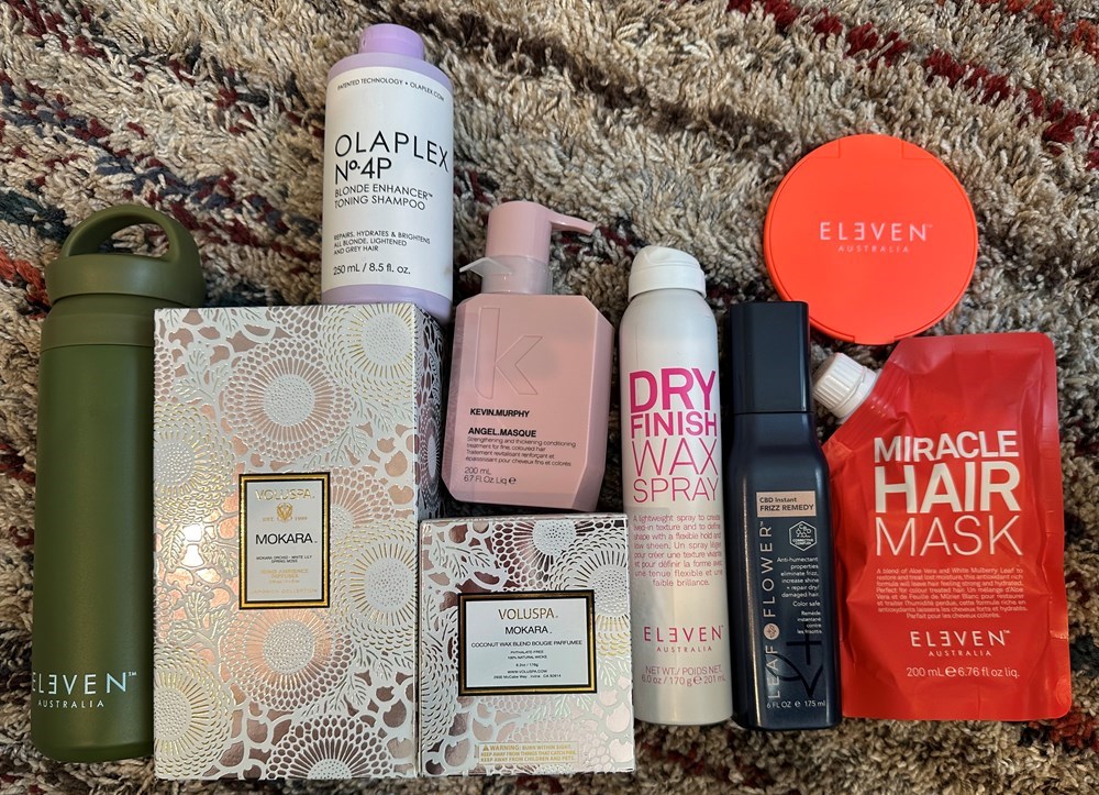 Mokara by Voluspa diffuser and candle. Kevin Murphy Hair conditioner, Olaplex Shampoo, Miracle Hair mask, Leaf Flower Frizz remedy, Dry finish wax spray, and compact mirror. Infusion Water bottle.