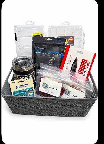 Items included: $25 Academy Gift card 2 Plano ProLatch Adjustable Compartment Tackle Boxes 24oz. Yeti Rambler Mug Bubba small shears Frog Toggs Microfiber Cooling Towel 5 Packs Handmade Craw lures made by Sophomore Player, Tyler Laughlin! (Watermelon Red, Gold Rush, Green Pumpkin, Mardi Gras, and Midnight) Value $150