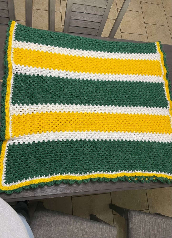 Handmade Crocheted Green, Yellow, and White Blanket. Measures 64"x32". Great for the game watching!!!